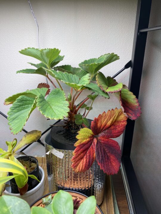 こちらは、ずっとリビングのLEDライトの下で育ててます。あまり調子がいいとは思えないですが、ランナーを伸ばしては切るを繰り返している状態。つぼみはいまのところありません。