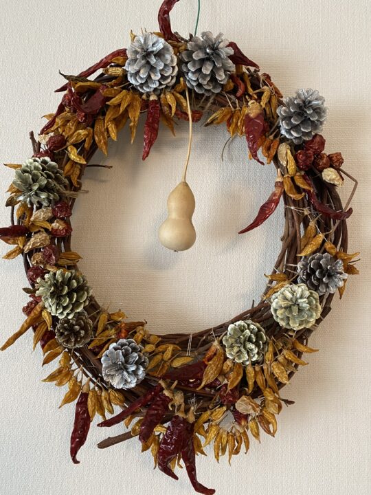 今は我が家の玄関で、お多福やこけし、ダルマさんたちと一緒に、賑やかに福を招いてくれています。 リースの中心には、あえて蔓(つる)付きのままの自然な子も。全部で5つの瓢箪が勢揃い!